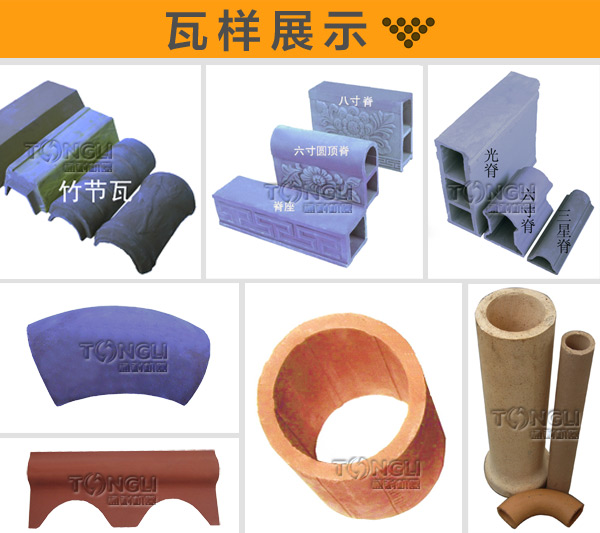 粘土瓦、琉璃瓦、仿古瓦、板瓦滴水、勾頭、自帶花脊、三曲瓦、羅馬式瓦、威尼斯式瓦、平瓦、板瓦、滴水瓦、筒瓦、貓頭瓦、紅磚等